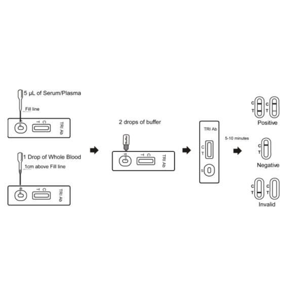 The TRI Antibody Rapid Test Cassette (Whole Blood/ Serum/Plasma) is a qualitative, membrane based immunoassay with a double antigen system for the detection of Trichinella antibodies in serum or plasma. The membrane is pre-coated with recombinant TRI antigens. The test cassette has a testing window. The testing window has an invisible T (test) line region and C (control) line region.